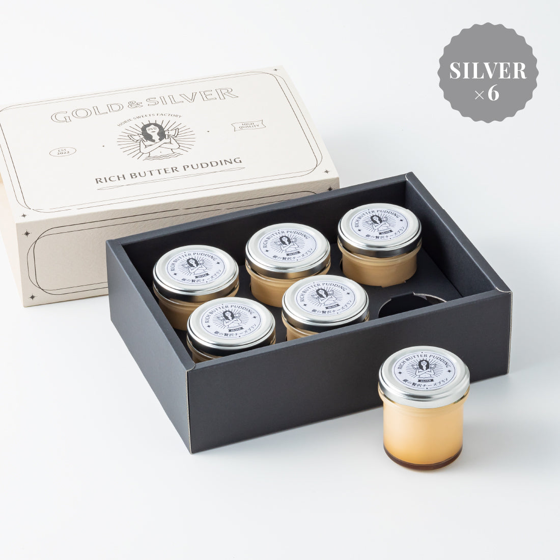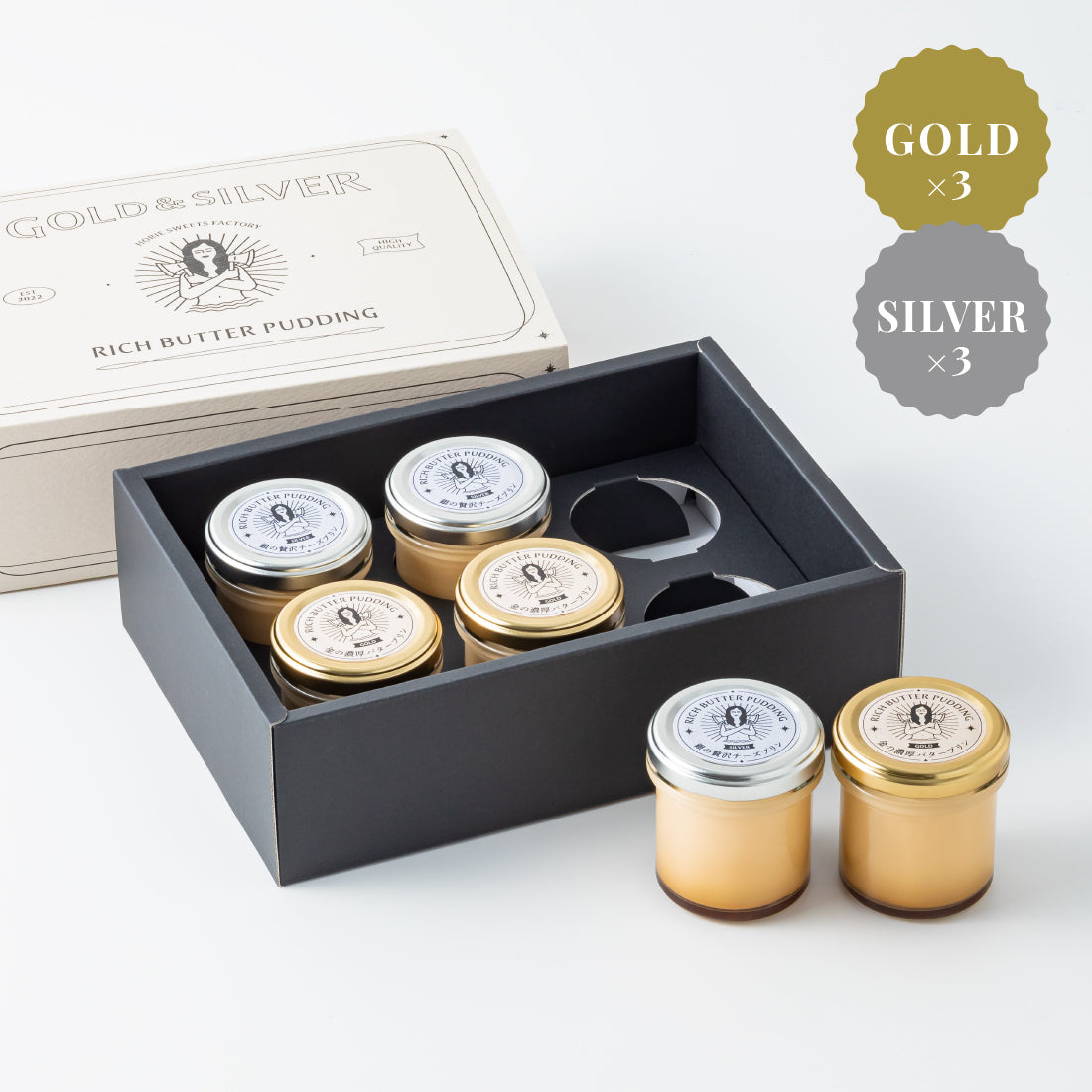 口溶けなめらかな金の濃厚バタープリンと、昔ながらの少し固め食感の銀の贅沢チーズプリンが3個ずつ入ったお得なボックスです。