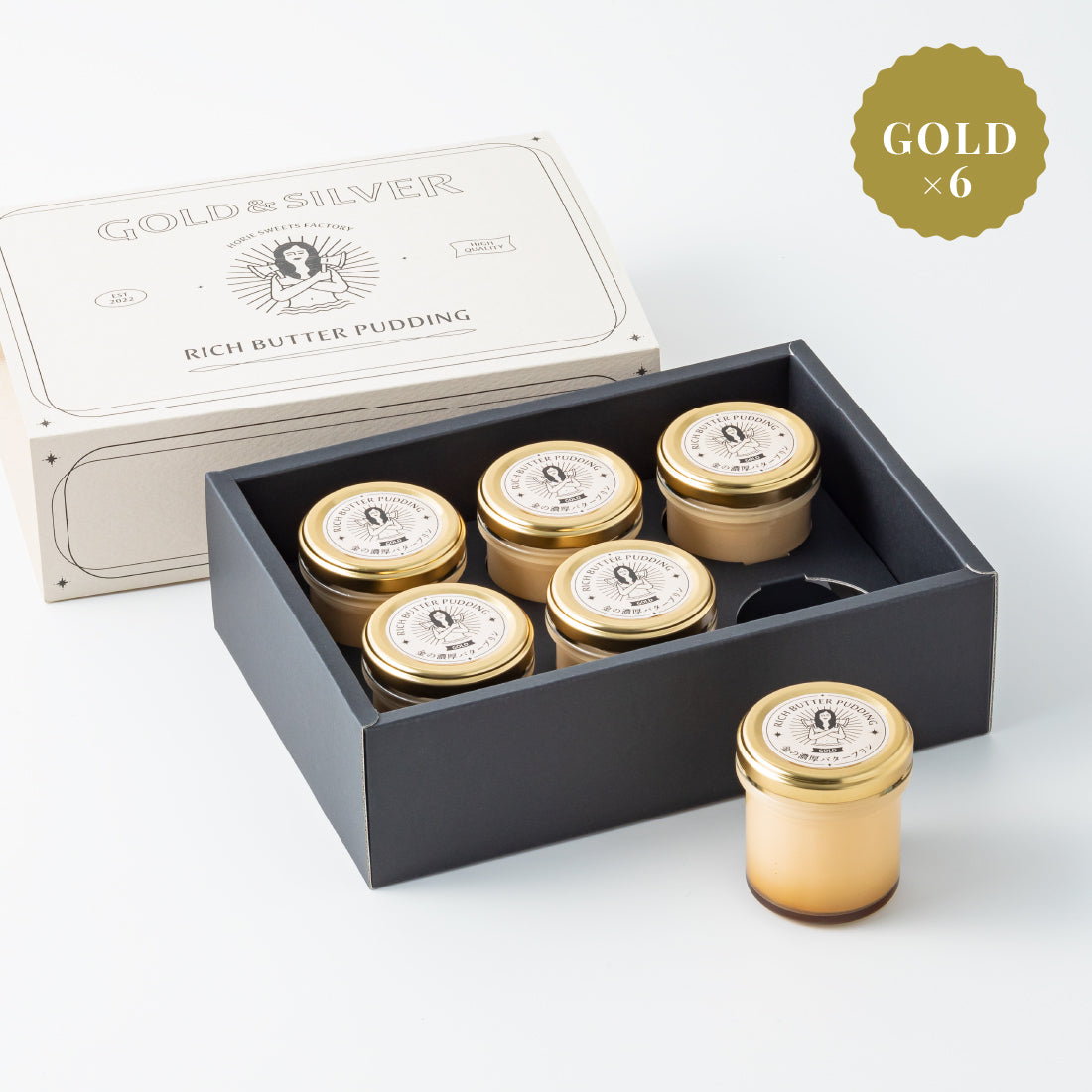 口溶けなめらかな金の濃厚バタープリンが6個入ったボックス。バターの芳醇な香りと、まろやかでコクのあるリッチななめらかプリンです。