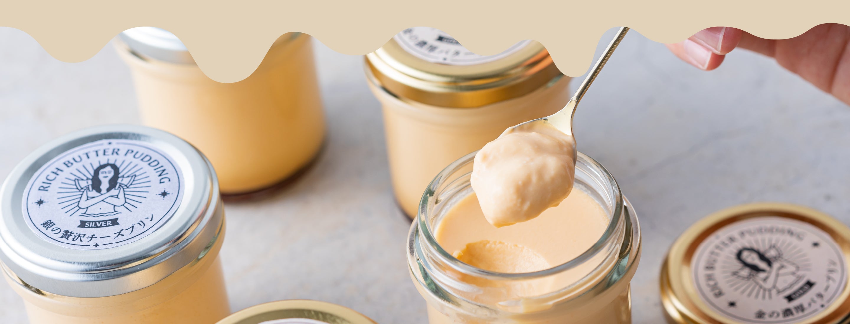 あなたが探しているのは金のプリン?それとも銀のプリン? こだわりのバターや生クリーム、素焚糖やチーズなど、厳選された素材で濃厚な口当たりに仕上げました。プリンは工房で一つひとつ真心を込めてシェフが手作りしています。大人の贅沢なひと時をお過ごしください。