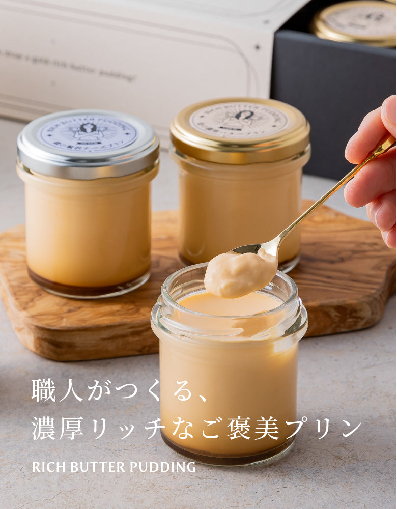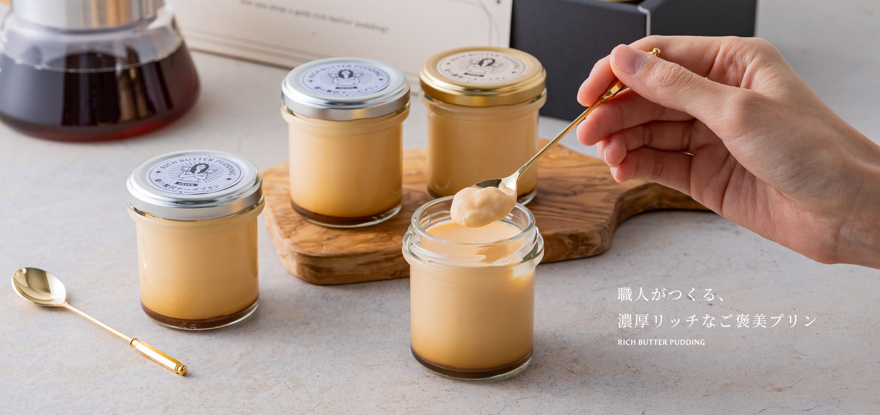 濃厚バターの味わい!口に入れた瞬間に香るバターならではの濃厚なコクのあるリッチな味わい。食感と素材にこだわったプリンです。